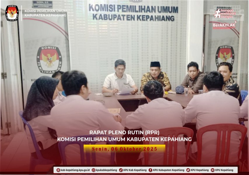 kab-kepahiang.kpu.go.id Komisi Pemilihan Umum Kabupaten Kepahiang melaksanakan Rapat Pleno Rutin (RPR) Senin (06/10/2025). Rapat dipimpin oleh Ketua KPU Kabupaten Kepahiang Ikrok, dihadiri oleh Anggota, Sekretaris, Pejabat Fungsional dan Pejabat Struktural Komisi Pemilihan Umum Kabupaten Kepahiang.