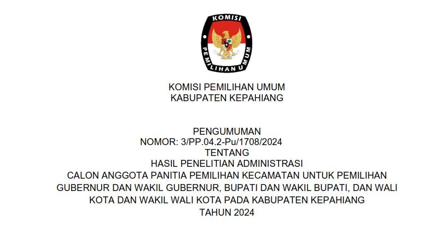 HASIL PENELITIAN ADMINISTRASI CALON ANGGOTA PPK Sabtu, 04 Mei 2024 07:00 620 PENGUMUMAN HASIL PENELITIAN ADMINISTRASI CALON ANGGOTA PPK Bagikan: Dilihat 620 Kali.