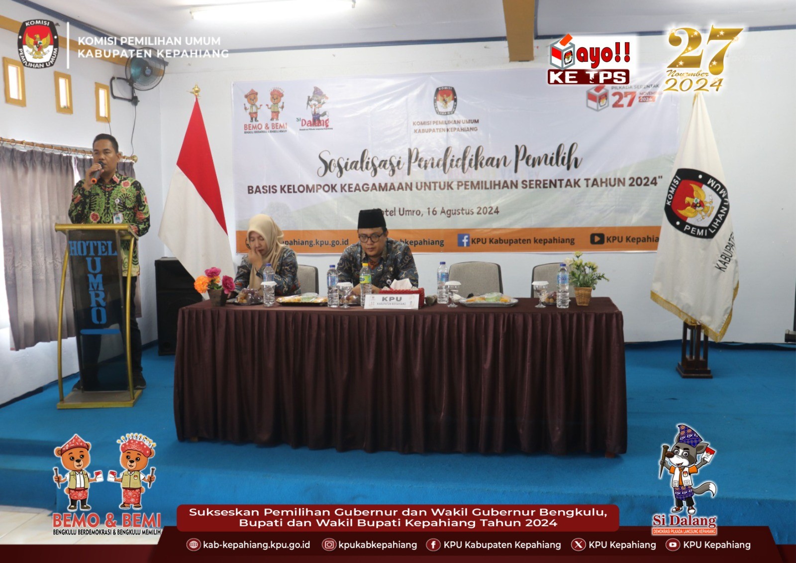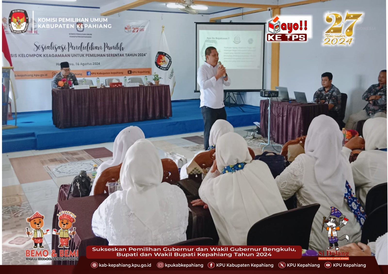 Kab-kepahiang.kpu.go.id Komisi Pemilihan Umum Kabupaten Kepahiang menggelar Sosialisasi Pendidikan Pemilih Pemilihan Serentak Tahun 2024, Jumat (16/08/24) bertempat di Aula Hotel Umroh Pasar Ujung Kepahiang.