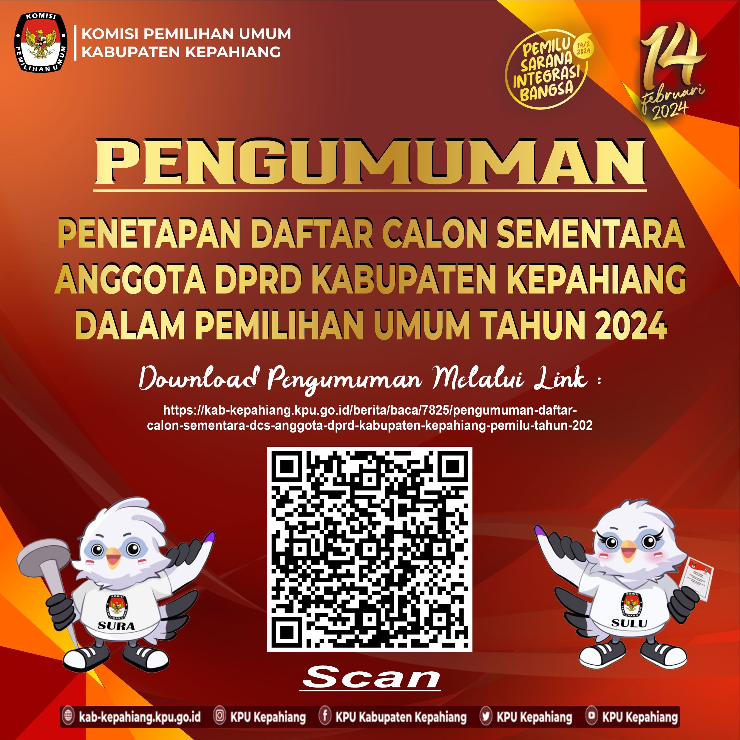 PENGUMUMAN DAFTAR CALON SEMENTARA (DCS) ANGGOTA DPRD KABUPATEN KEPAHIANG PEMILU TAHUN 2024 Sabtu, 19 Agustus 2023 07:00 1115 PENGUMUMAN DCS ANGGOTA DPRD KABUPATEN KEPAHIANG PEMILU TAHUN 2024 Bagikan: Dilihat 1,115 Kali.