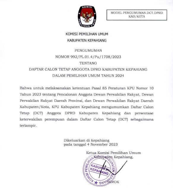 Pengumuman Daftar Calon Tetap (DCT) Anggota Dewan Perwakilan Rakyat Daerah Kabupaten Kepahiang Dalam Pemilihan Umum Tahun 2024