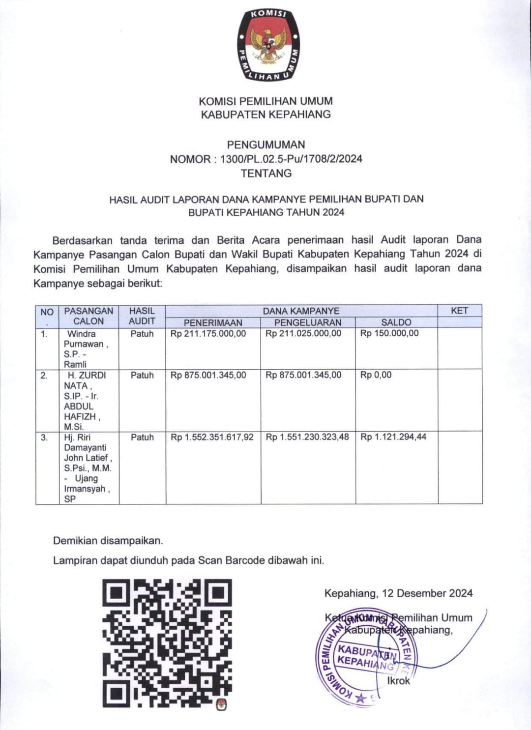 Pengumuman Hasil Audit Dana Kampanye Pemilihan Bupati dan Wakil Bupati Kepahiang Tahun 2024 Kamis, 12 Desember 2024 07:00 512 Pengumuman Hasil Audit LDK Pemilihan Tahun 2024 pdf Bagikan: Dilihat 512 Kali.