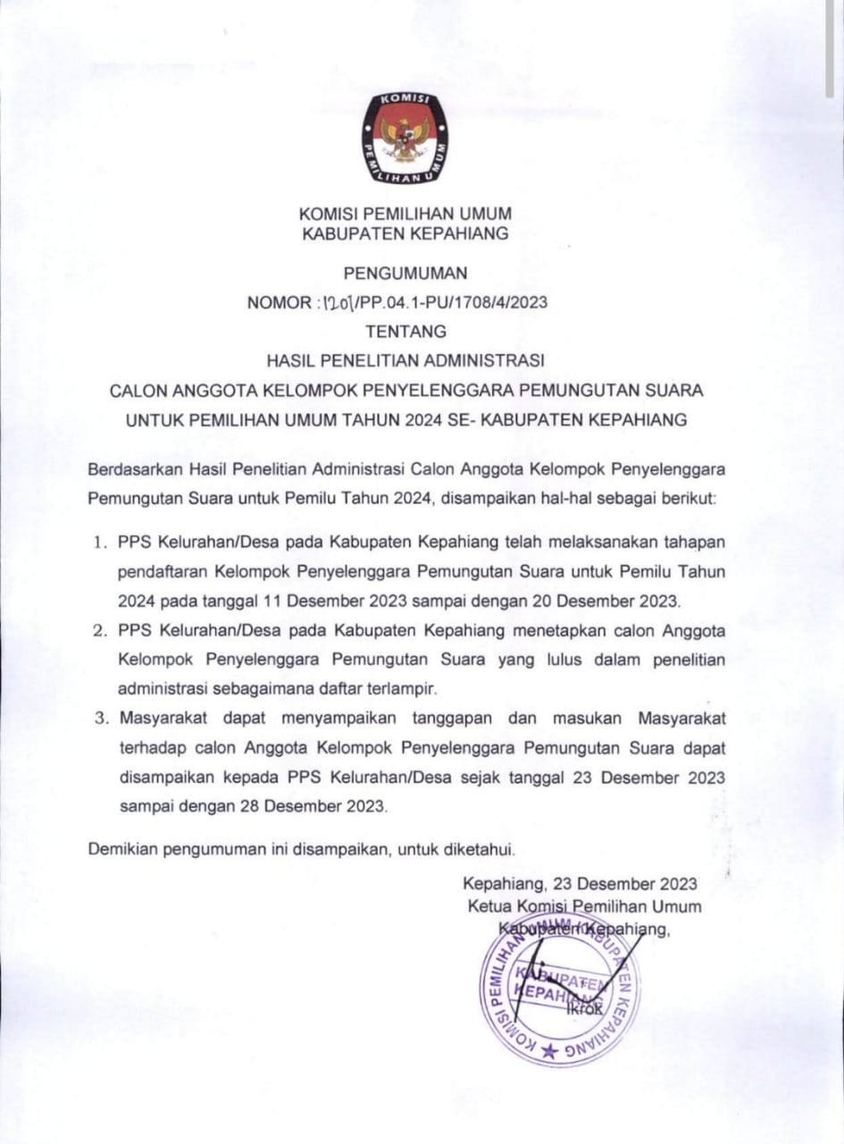 PENGUMUMAN HASIL PENELITIAN ADMINISTRASI CALON ANGGOTA KPPS UNTUK PEMILU TAHUN 2024 SE-KABUPATEN KEPAHIANG
