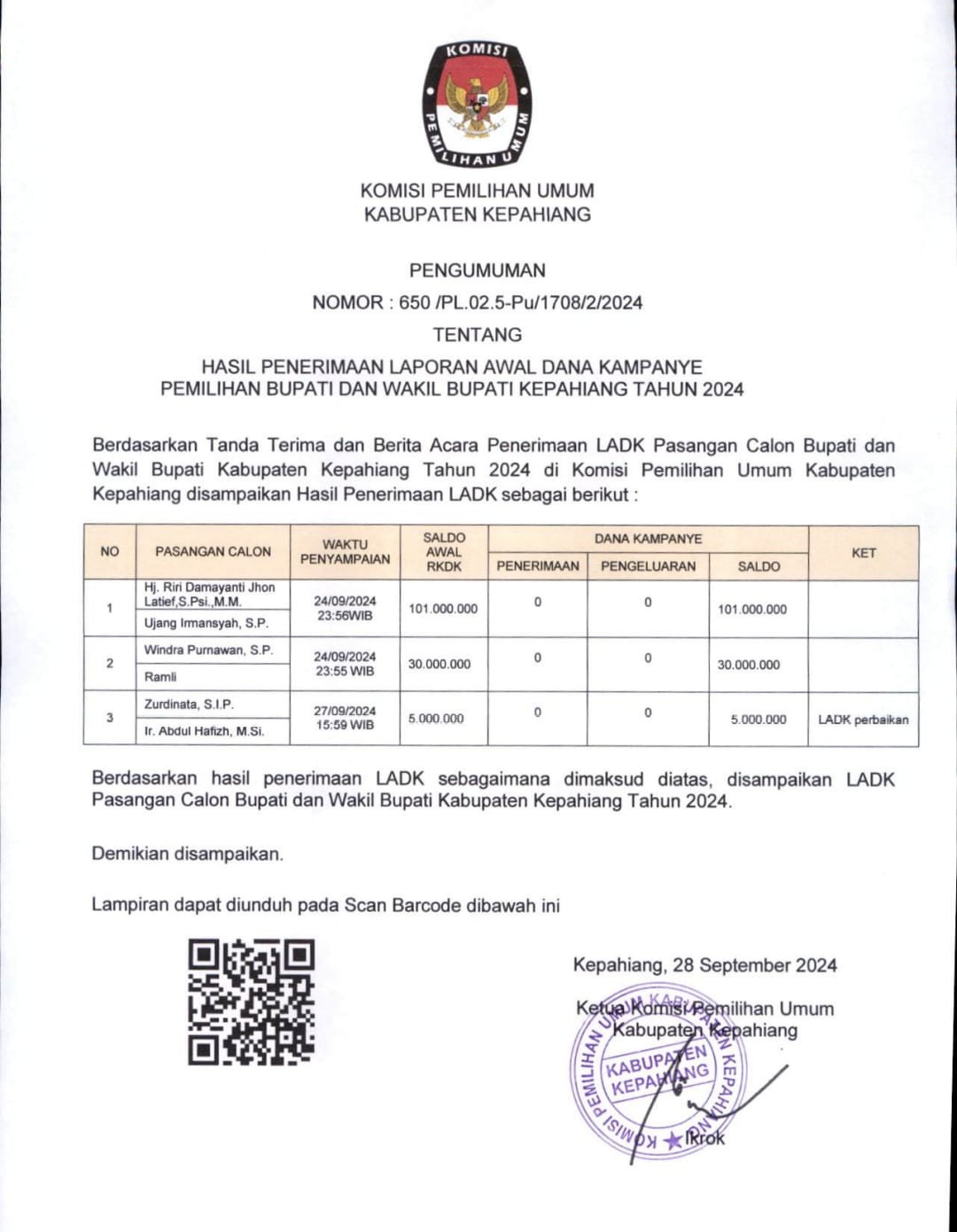 PENGUMUMAN HASIL PENERIMAAN LAPORAN AWAL DANA KAMPANYE PEMILIHAN BUPATI DAN WAKIL BUPATI KEPAHIANG TAHUN 2024 Sabtu, 28 September 2024 07:00 401 PENGUMUNAN PDF klik disini Bagikan: Dilihat 401 Kali.
