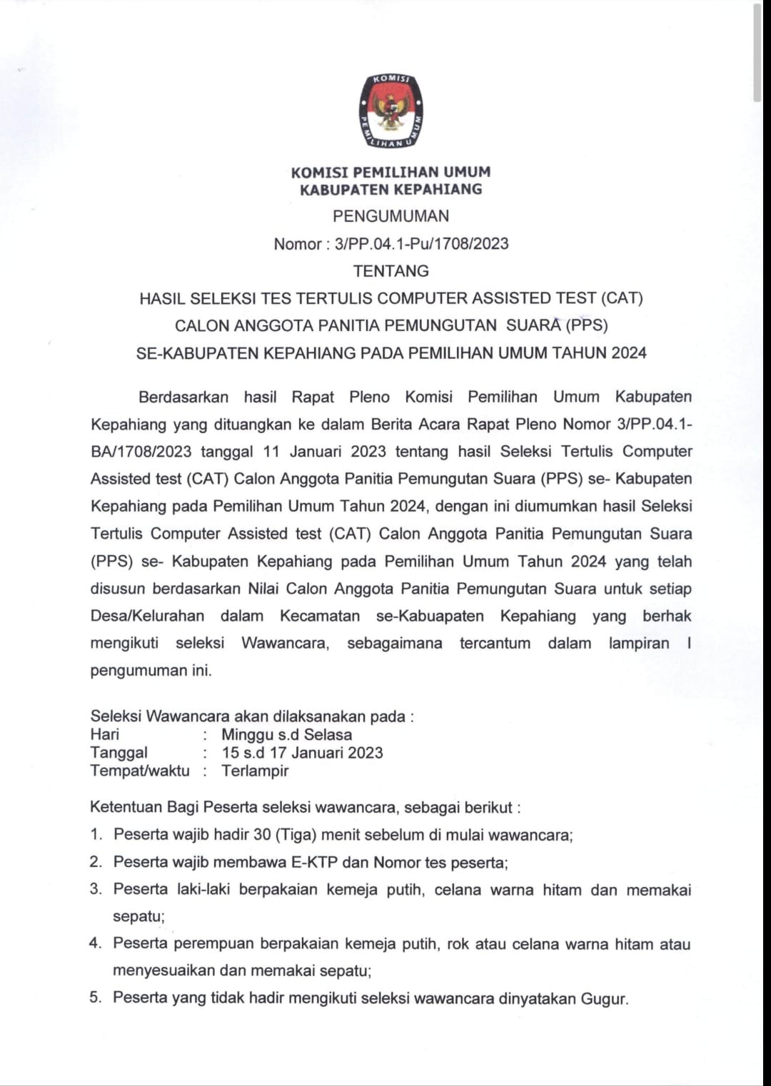 PENGUMUMAN HASIL SELEKSI TERTULIS COMPUTER ASSISTED TEST (CAT) CALON ANGGOTA PPS SE-KABUPATEN KEPAHIANG PEMILU TAHUN 2024 Kamis, 13 April 2023 07:00 718 https://kab-kepahiang.kpu.go.id/public/kab-kepahiang/dmdocument/1673672591PENGUMUMAN HASIL SELEKSI TES TERTULIS CAT PPS SE-KABUPATEN KEPAHIANG_compressed.pdf Bagikan: Dilihat 718 Kali.
