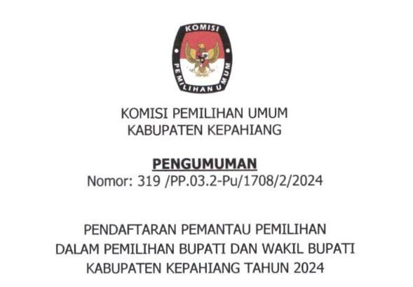 PENGUMUMAN PENDAFTARAN PEMANTAU PEMILIHAN BUPATI DAN WAKIL BUPATI KEPAHIANG TAHUN 2024 Jumat, 22 Maret 2024 07:00 404 PENGUMUMAN PENDAFTARAN PEMANTAU PEMILIHAN Bagikan: Dilihat 404 Kali.