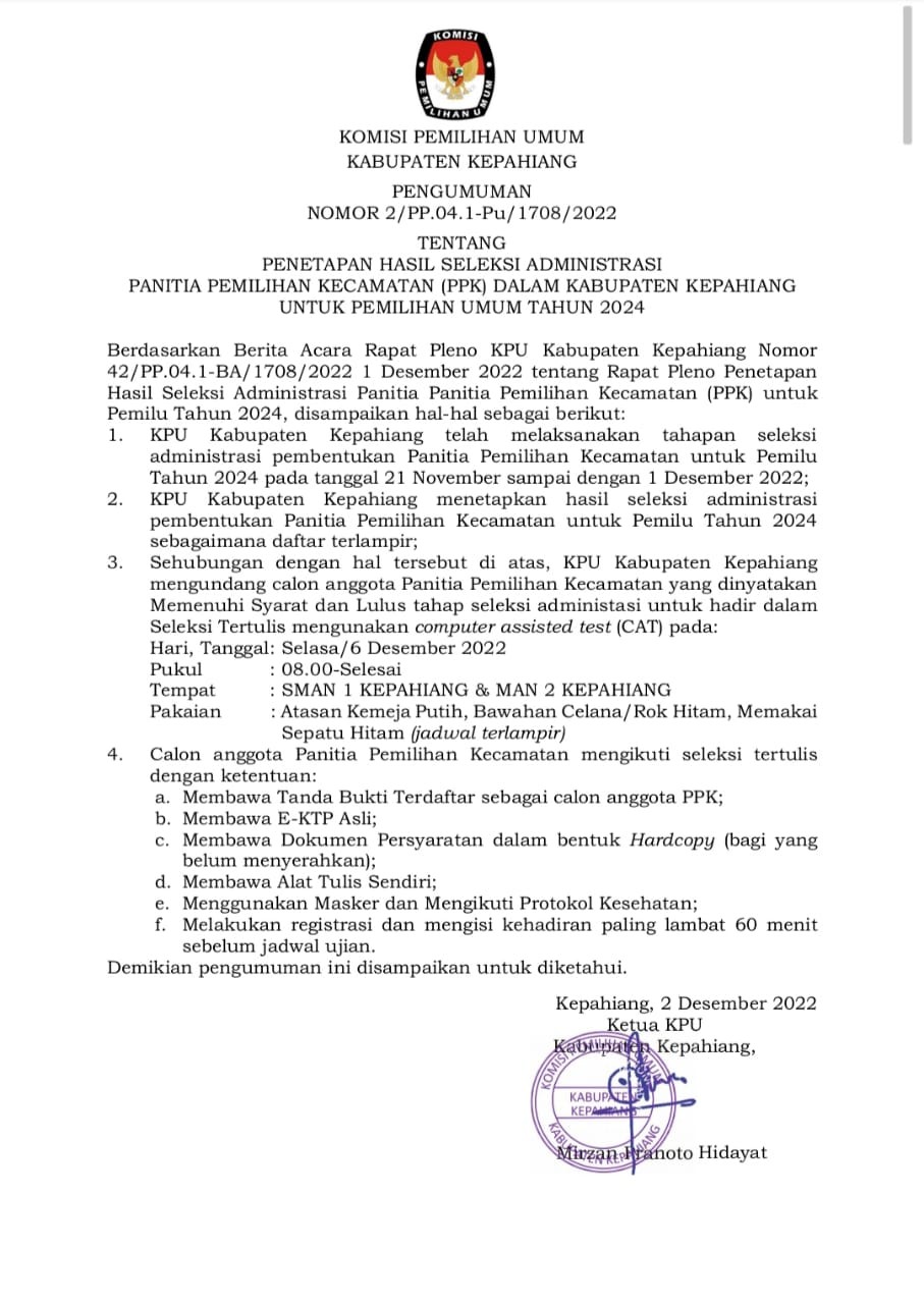 Pengumuman Tentang Penetapan Hasil Seleksi Administrasi PPK Dalam Kabupaten Kepahiang Untuk Pemilu Tahun 2024